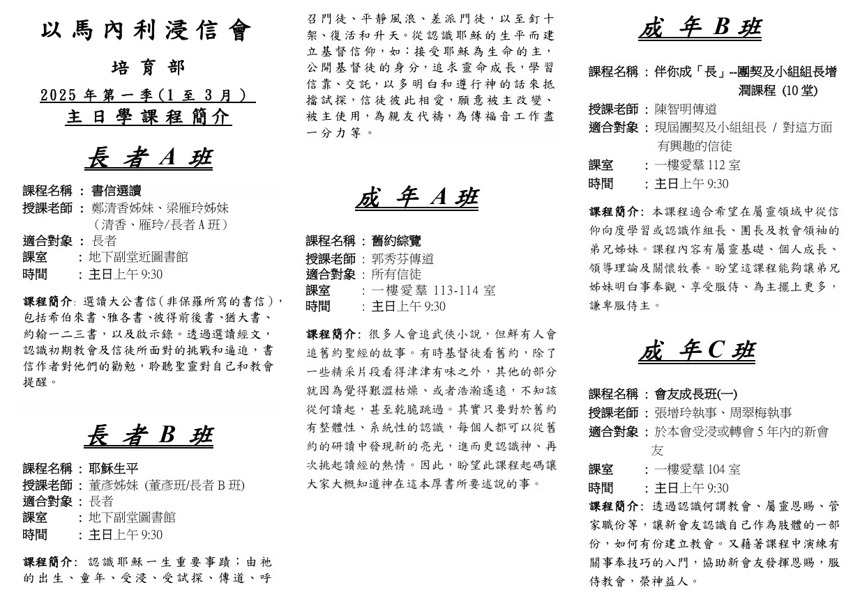 11 Dec 2025年第一季(1-3月)主日學課程簡介 Tags: 最新消息 0 Comments 兄姊們請填寫報名表或網上的形式報名 (https://forms.gle/GAqUbs6PN54J5w8n7) 。 若有任何查詢,請向辦公室同工或陳景通弟兄查詢。