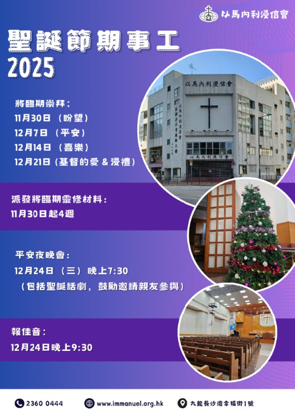 崇拜程序表: https://www.immanuel.org.hk/sites/default/files/Immanuel-WorshipBulletin.pdf